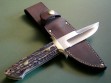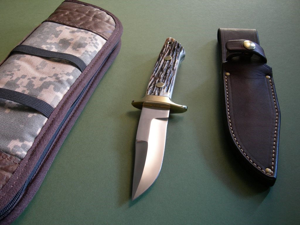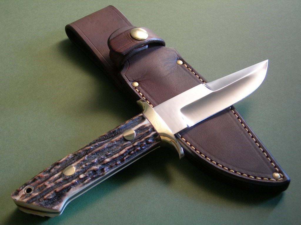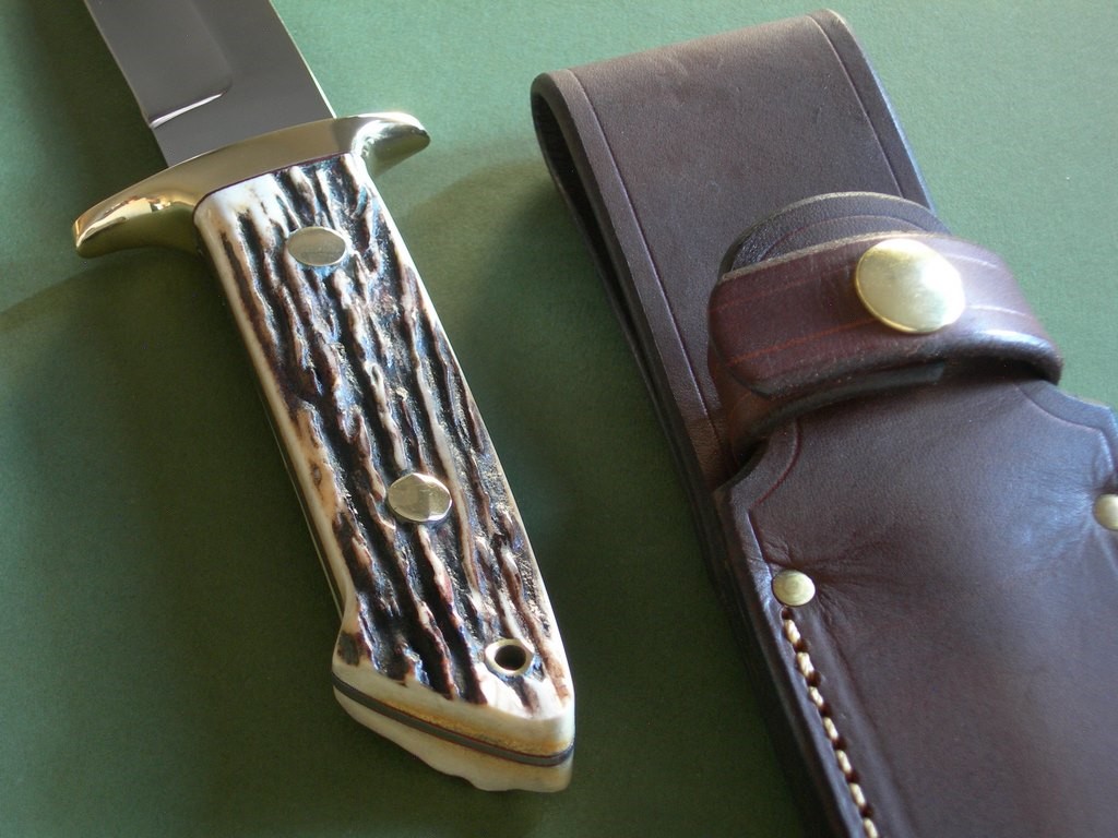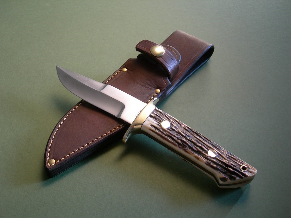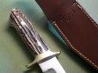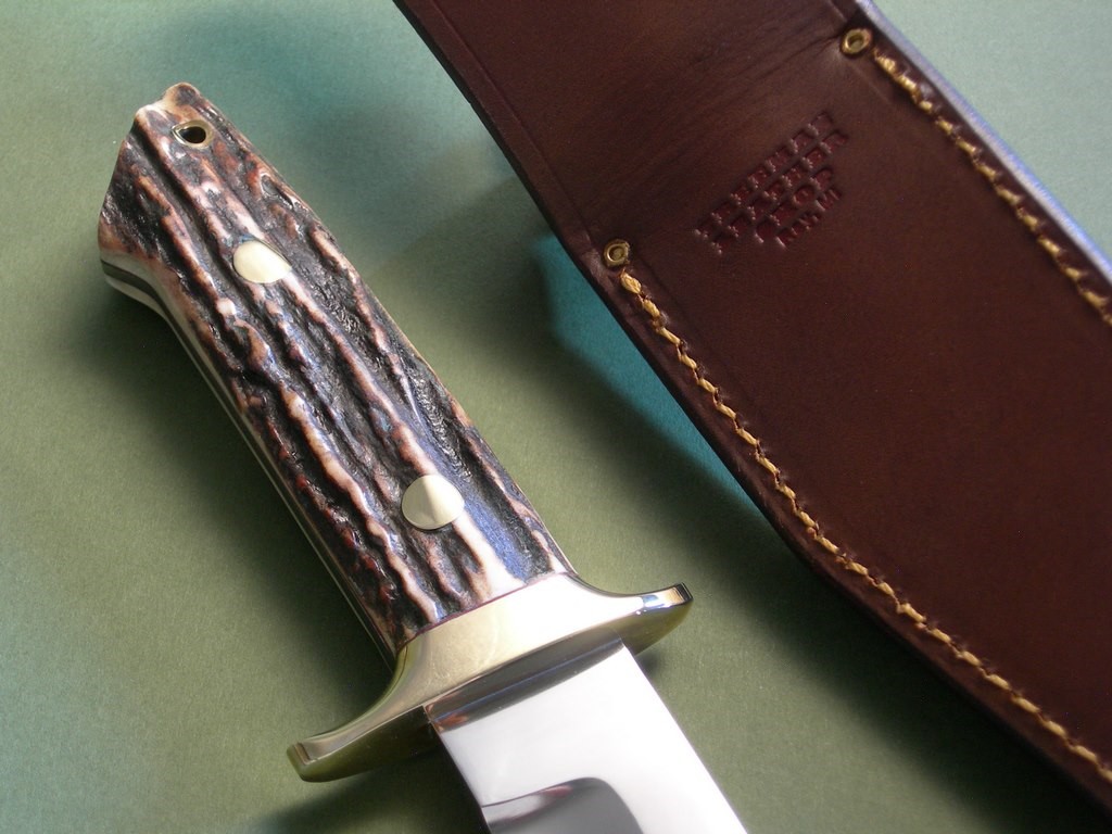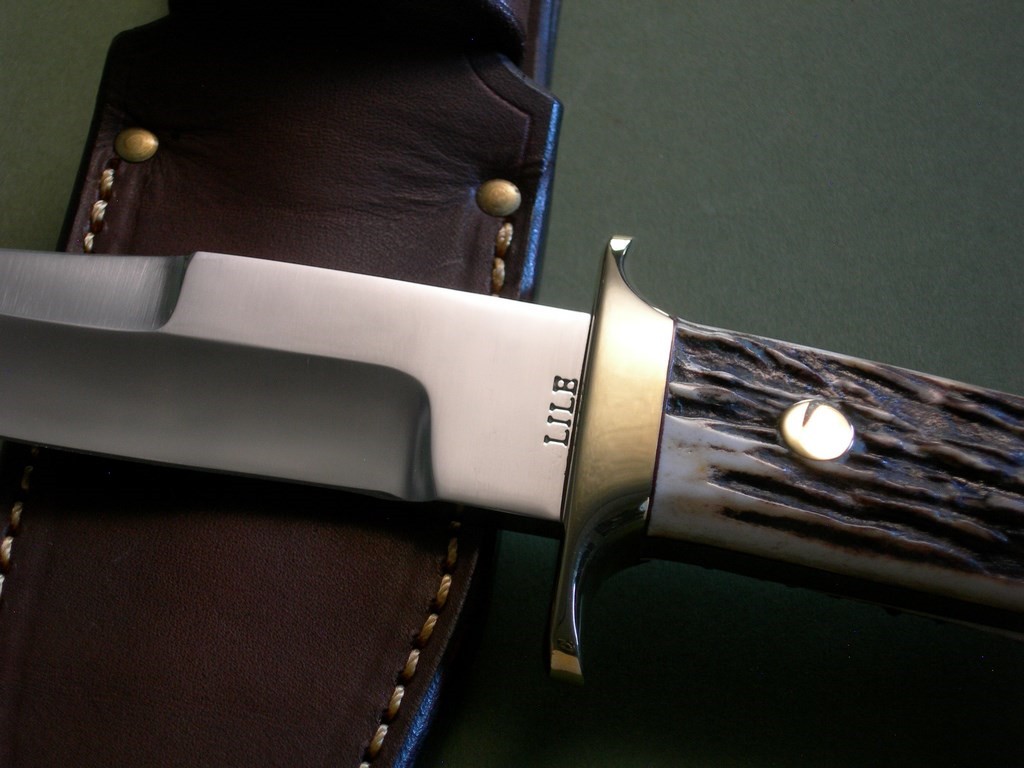 Summary: one of a couple pre-death Lile knives I have for sale, this the Chute knife with 4-1/2" blade, double brass guard and pins, and beautiful deep cut stag handle drilled and lined for lanyard. Tapered tang with thin red tang liners, overall length is 9-1/4". The knife is in near mint condition with a perfect edges, truly outstanding.