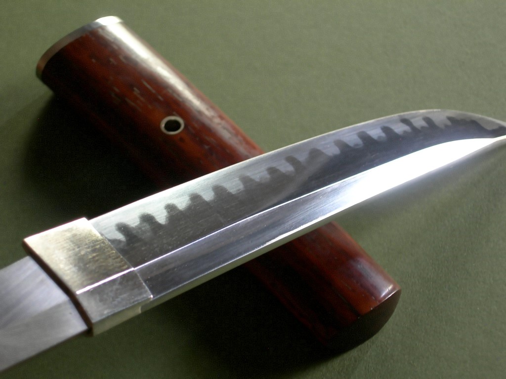 This knife has a 6-1/4” mirror polished blade with very visible hamon, overall length is 11-3/8”. Condition is near mint, nothing but a few light handling marks at most. Pin through the wood handle that comes out to remove the handle, it’s tight and I only removed it so I could photograph the tang stampings. The original wood scabbard fits perfectly, all said and done a gorgeous, rare, unique and collectible Lile knife!!