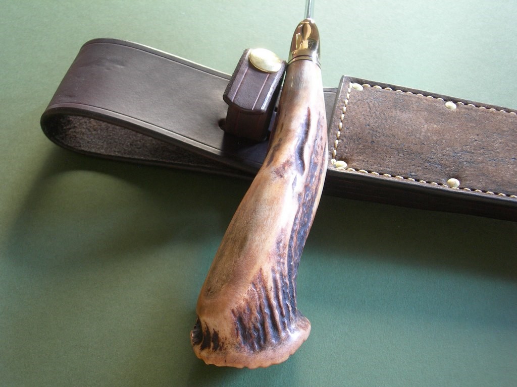 This knife has an 8” double edged blade, brass guard, maroon / red spacers and above mentioned crown stag. Gorgeous knife, excellent condition with original edges. Blade width at the guard is 1-1/2”, 14-1/4’ overall.