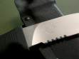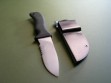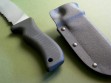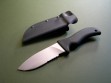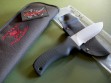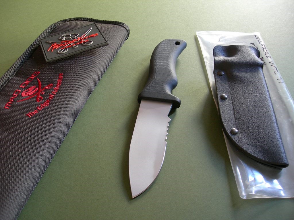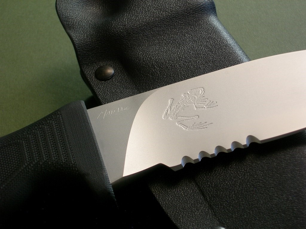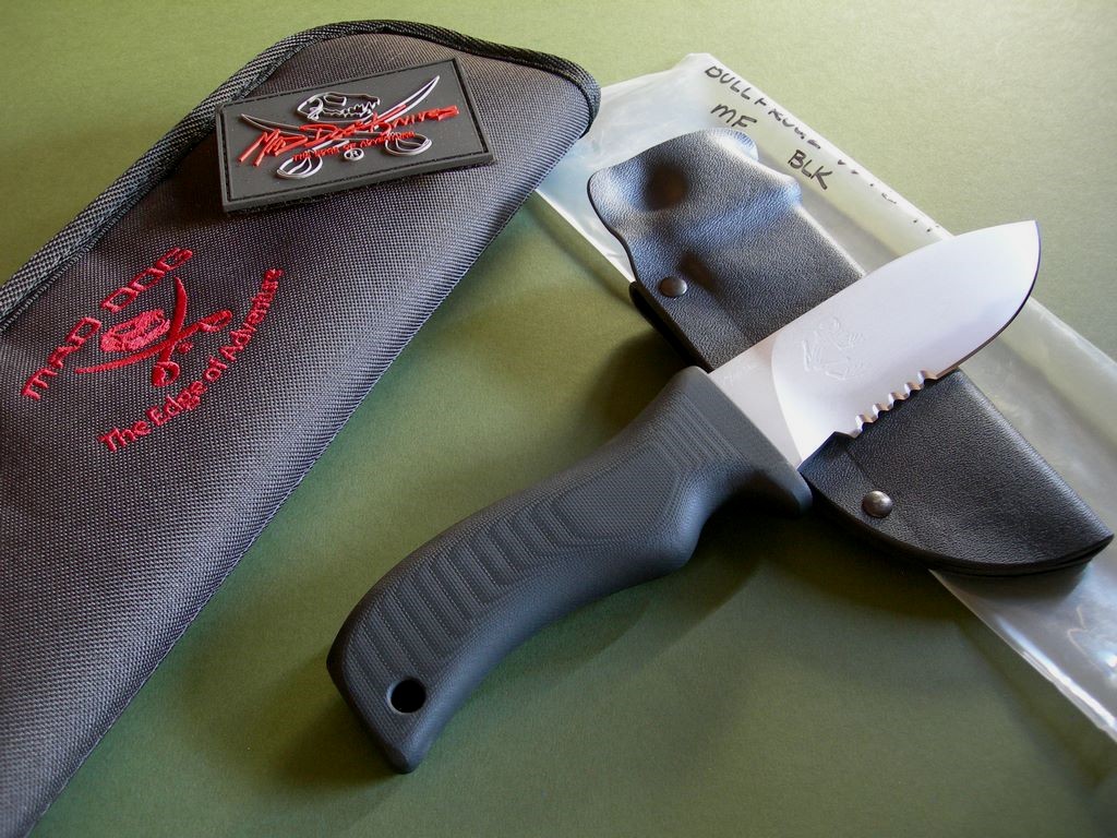 This knife has a 5" hard chromed partially serrated blade with VVTL finish, custom skeletal frog etch, T1 choil and black handle. Mad Dog signature on the back ricasso, of course. Made from ¼” blade stock (super stout), overall length is 10". The black handle material is the proprietary glass / epoxy composite -- compression bonded to the hidden full tang and incredibly ergonomic. Brand new / mint condition.