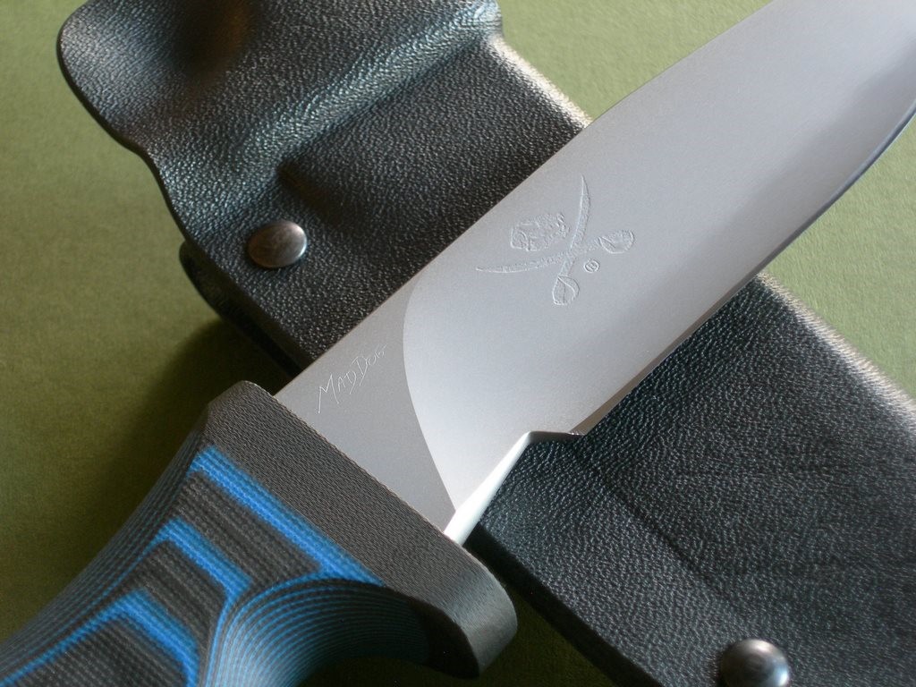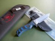 Summary: this is a brand new Mad Dog Pygmy ATAK with a 5" hard-chromed blade, small JMD and VVTL finish. The handle material is the proprietary glass / epoxy composite -- compression bonded to the hidden full tang and incredibly ergonomic. This one’s the black & blue handle material, looks great. This is a very stout knife made from 1/4" blade stock – overall length is 9-1/2". Just in with a handful of others on consignment… mint condition.