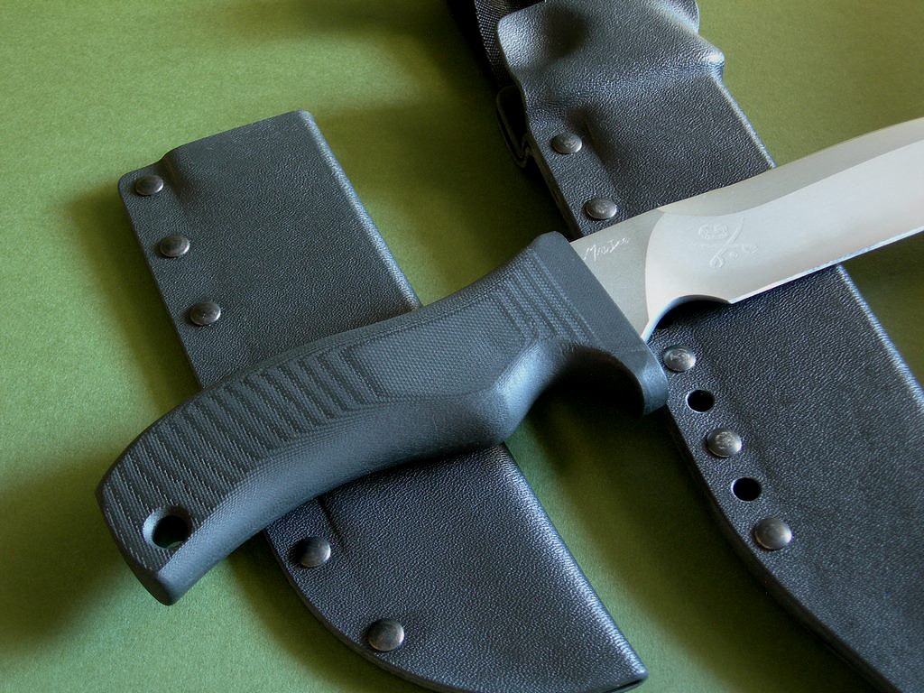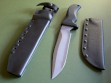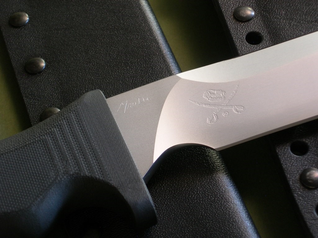 This knife has 7" hard chromed blade with VVTL finish, Mad Dog etched signature on the ricasso, and small JMD trademark on the blade. Razor sharp edges and extremely versatile, 1/4" blade stock with the optional T3 choil. The handle material is the proprietary glass / epoxy composite -- compression bonded to the hidden full tang and incredibly ergonomic. Overall length is 12", the knife is in mint condition.