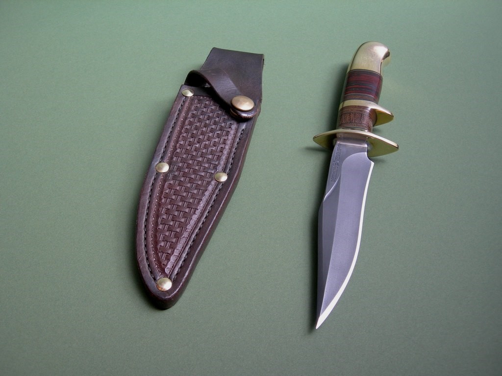 Summary: made back in 2015, this is a shop custom subhilt Wraith made by James Behring, Jr. / Behring Made Knives. Numbered 063 on the back (check out the flag above the number, totally cool), the knife has never been used and has the original edge. Paired to a custom riveted sheath made by Glacier Leather with tooling on the front, a totally awesome package PERFECT for EDC or collection purposes.