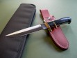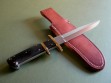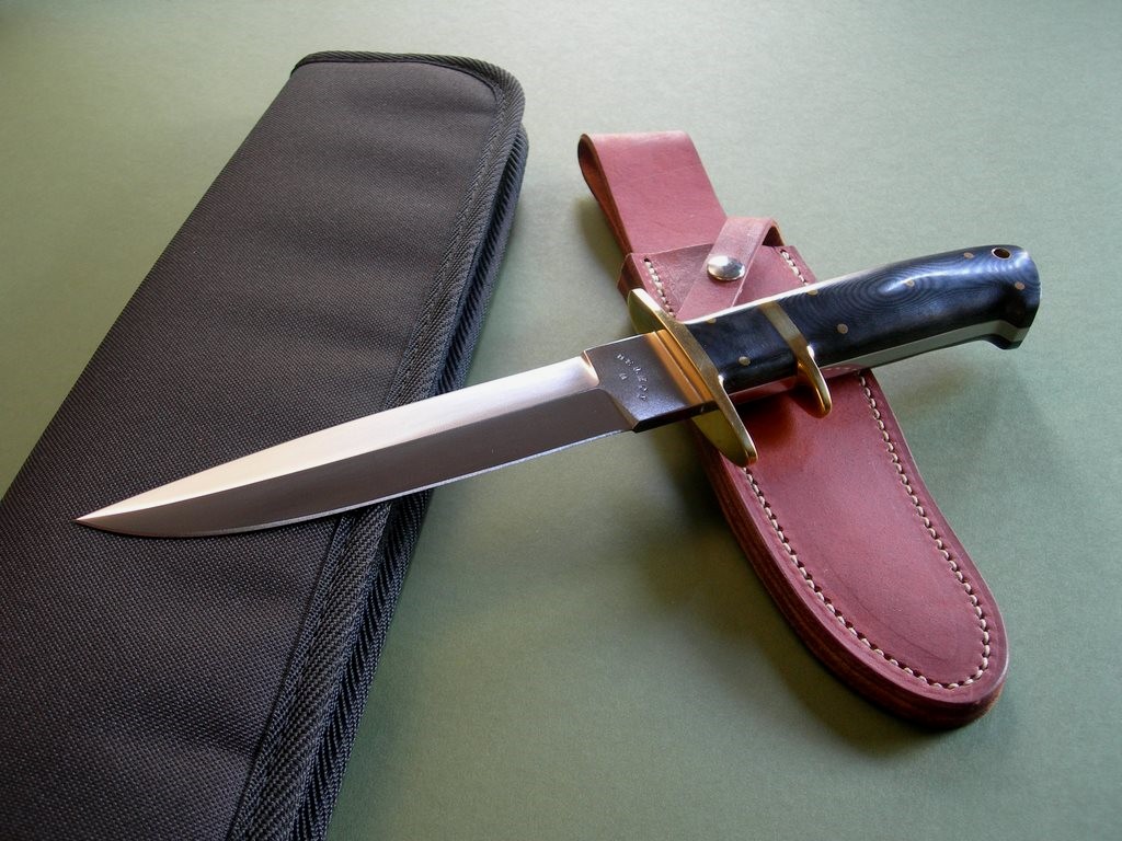 Summary: this is an unused A1 subhilt fighter made by the late Enedino De Leon. This knife has an 7" double-edged satin finish blade (upper clip sharpened back approx. 6"), brass guards, and pinned black micarta scales on a non-tapering tang with white tang liners. It's an awesome fighter that feels great “in hand”, overall length is 12-1/2". The blade is perfect with original edges, overall excellent+++ or better condition with just very light wipe marks on the brass hardware.