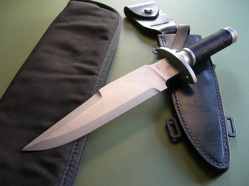 Summary: a Jack Crain Life Support System MCS Predator movie knife. Knife and sheath are in excellent condition, I don't believe the knife has been used nor the sheath carried. Very light but visible spots on the upper flat front side, light but visible sheath mark on the back side, a few handling / storage marks on the guard. Collar, butt cap and black handle wrap looks great, no issues.