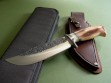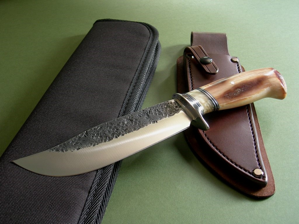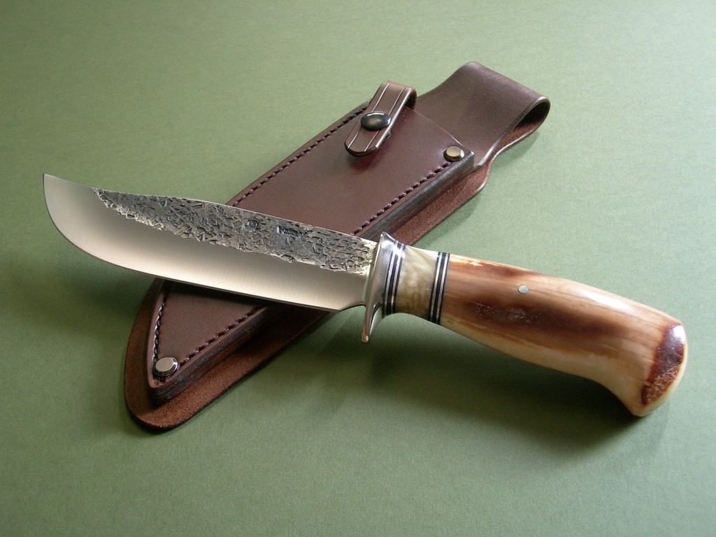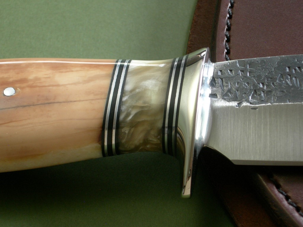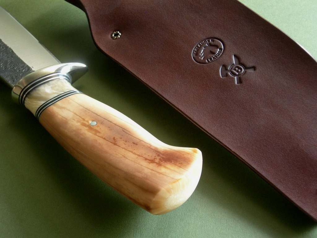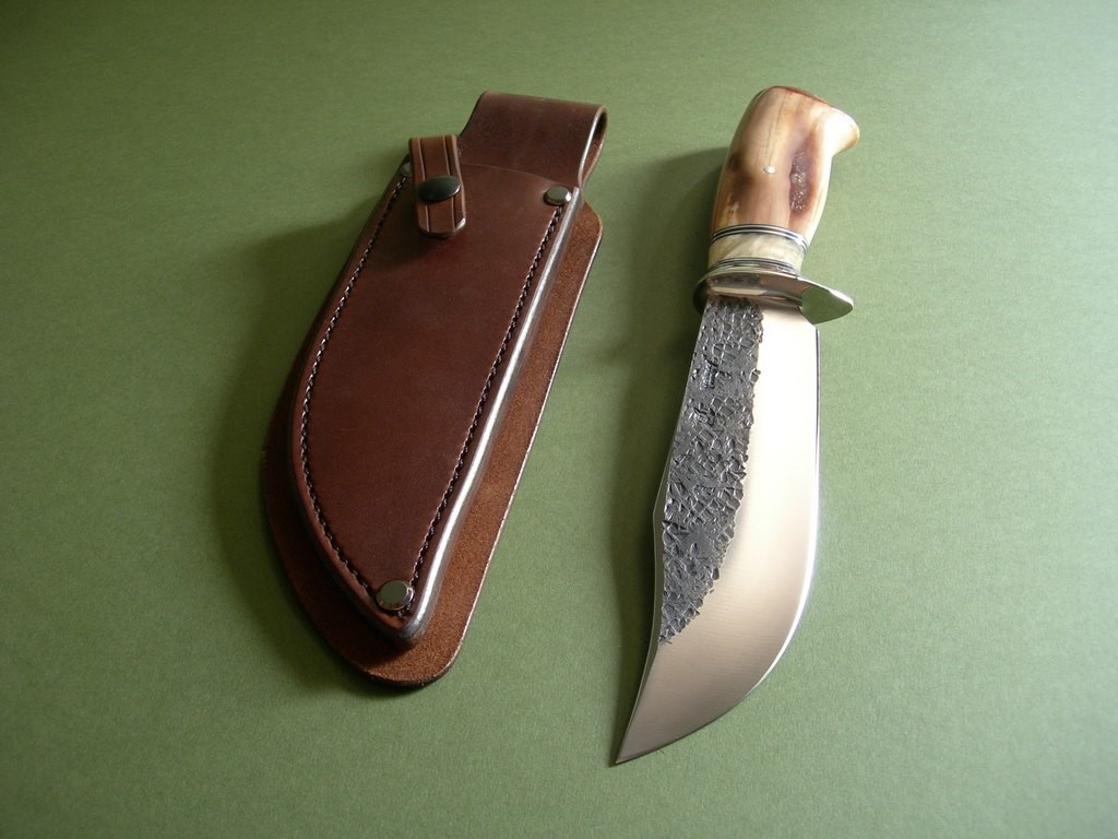 Summary: a beautiful BMK custom with a 7” hammer-marked bowie clip grind, nickel guard and fabulous stack with thick musk ox boss spacer. If that’s not enough, an awesome crow’s beak fossil walrus handle completes the knife. Made from ¼” stock and relatively heavy in hand, overall length is 12-1/4”. Pre-owned, properly stored, mint condition.