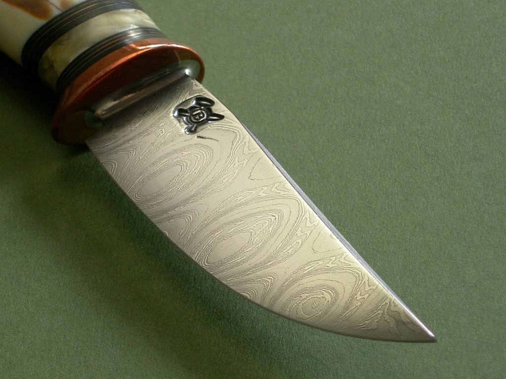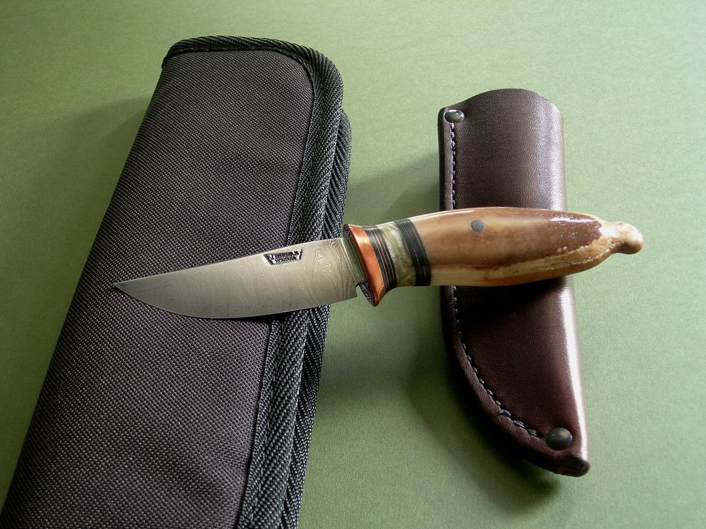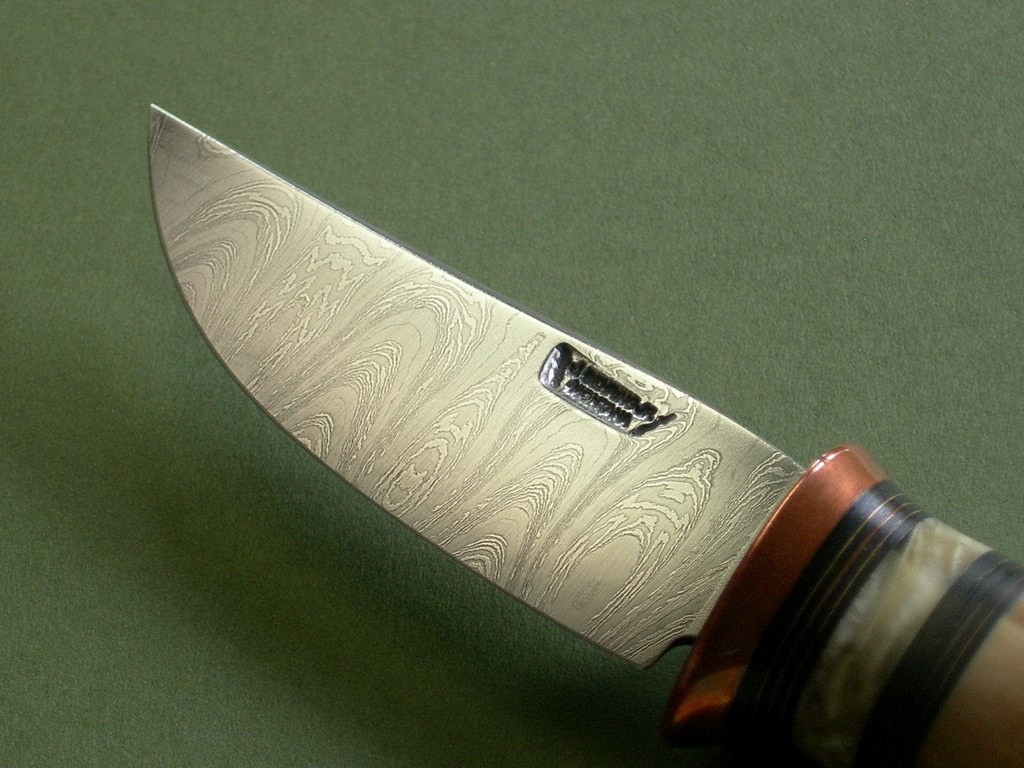 Summary: a beautiful one of a kind BMK custom with Damascus blade, copper guard and beautiful artifact fossil handle. Comes in a custom Warlander pouch sheath. Razor sharp, overall length is a hair over 7-1/8”. Mint condition with patina on the copper guard.
