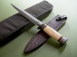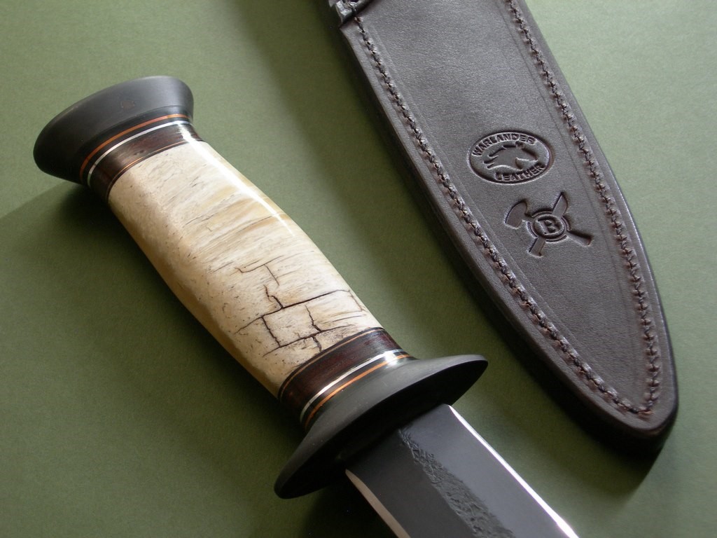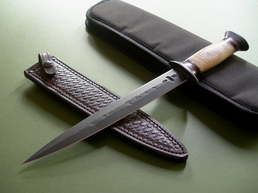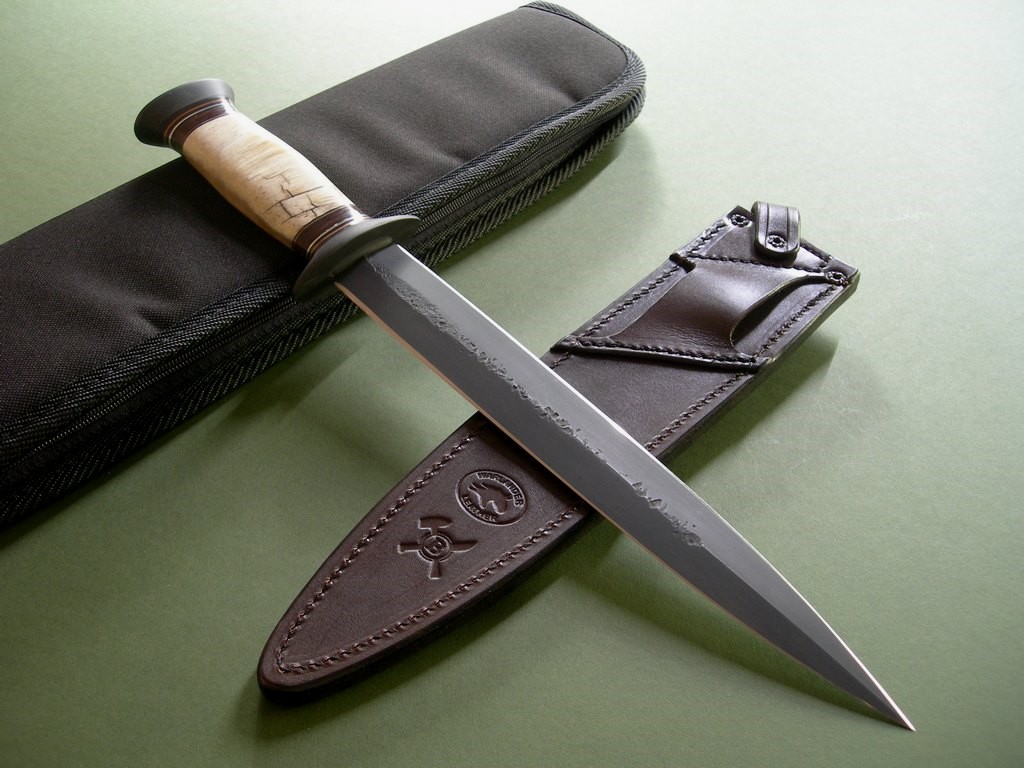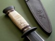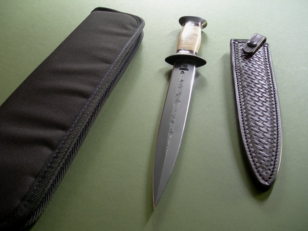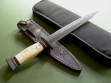 This is a custom Fairbairn-Sykes dagger made by James Behring, Jr. / Behring Made Knives. The blued blade has both stamps plus the skull, overall length is 14-5/8”. The knife was fitted with stainless hardware and a super nice Musk Ox Boss handle. Some checking on the back side that is rock solid, IMO only adds additional personality to an already kick ass knife. The knife has never been sharpened and is in mint condition.