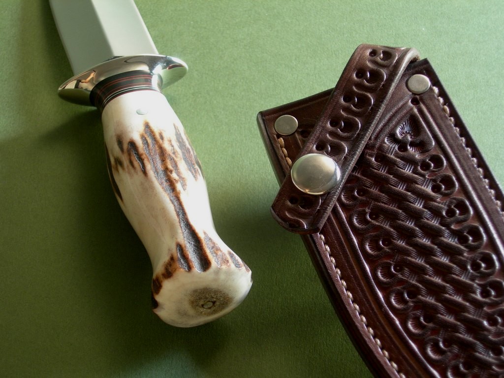 The knife comes with the original Mosher high-ride sheath with front side tooling. Boot / belt slip on the back, the sheath is in mint condition.