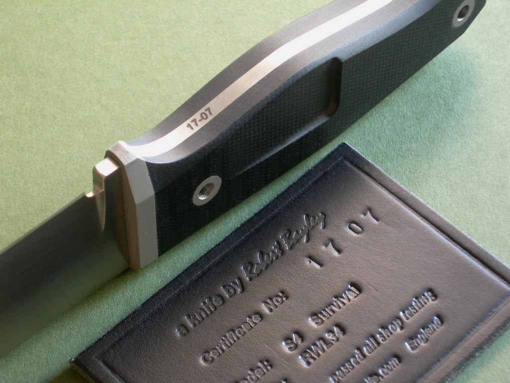 Summary: this is an original / unused Rob Bayley S4 knife. The makers signature "bayleyknife" on the upper tang, serial #17-07 on the lower tang. (7th knife made in 2017) The knife has a 4” blade, stainless guard, black G10 handle scales and comes with a black leather survival sheath and C.O.A. OAL right at 8-1/2”.