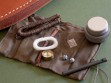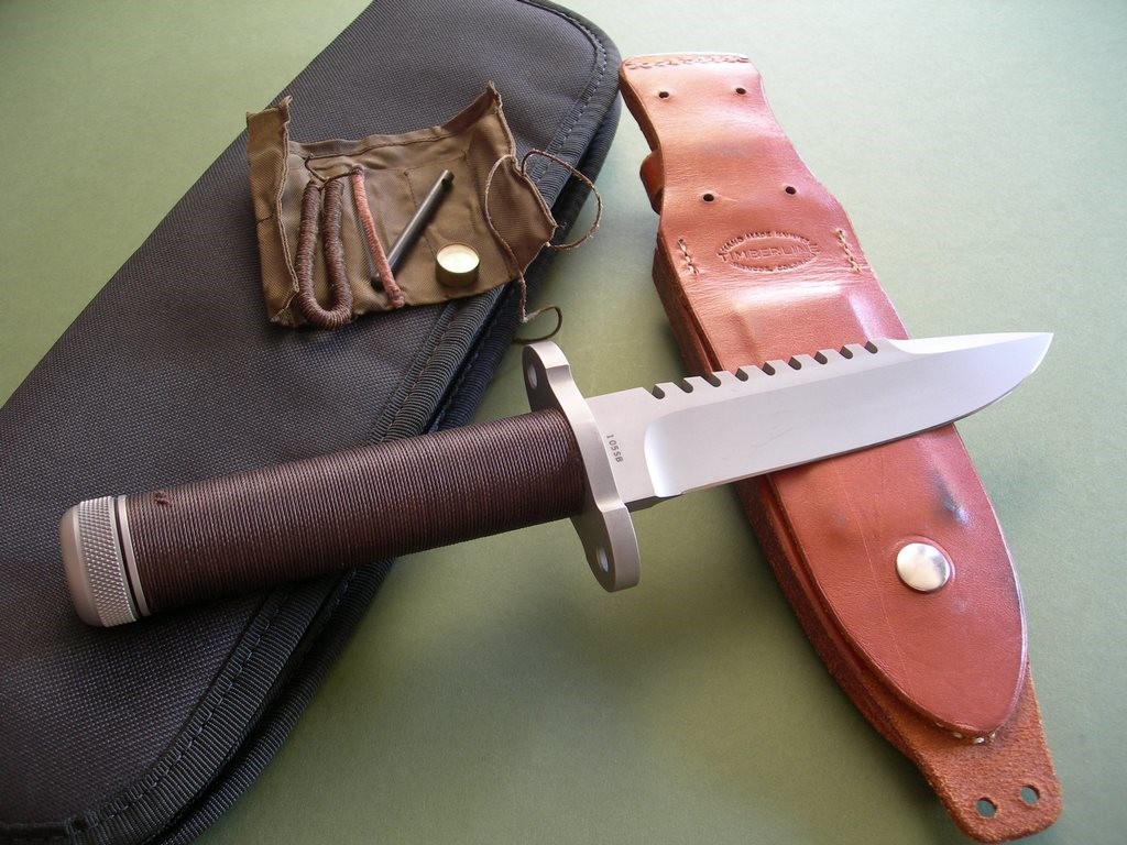 Summary: this is an original 1980's Timberline SB 5-3/4" hollow handle survival knife and original sheath. Serial #105SB, the knife is in excellent+++ or better condition, unused with original edges. There are a few very light marks on the blade, quite small and only visible in direct light. A few light scuffs on the guard that will probably buff out, I didn't want to mess with the finish and left them alone. The original brown handle wrap looks great – one very small area of abrasion on the back side near the butt cap. (see photo 7) The original pouch with survival gear still in the handle, looks like everything is there except for the two flies. Assume the basics: hooks, fishing line, sinkers, sparking flint, snare cord... everything to choke / feed / set yourself on fire if given enough time. All said and done, a very clean vintage piece in unused condition.
