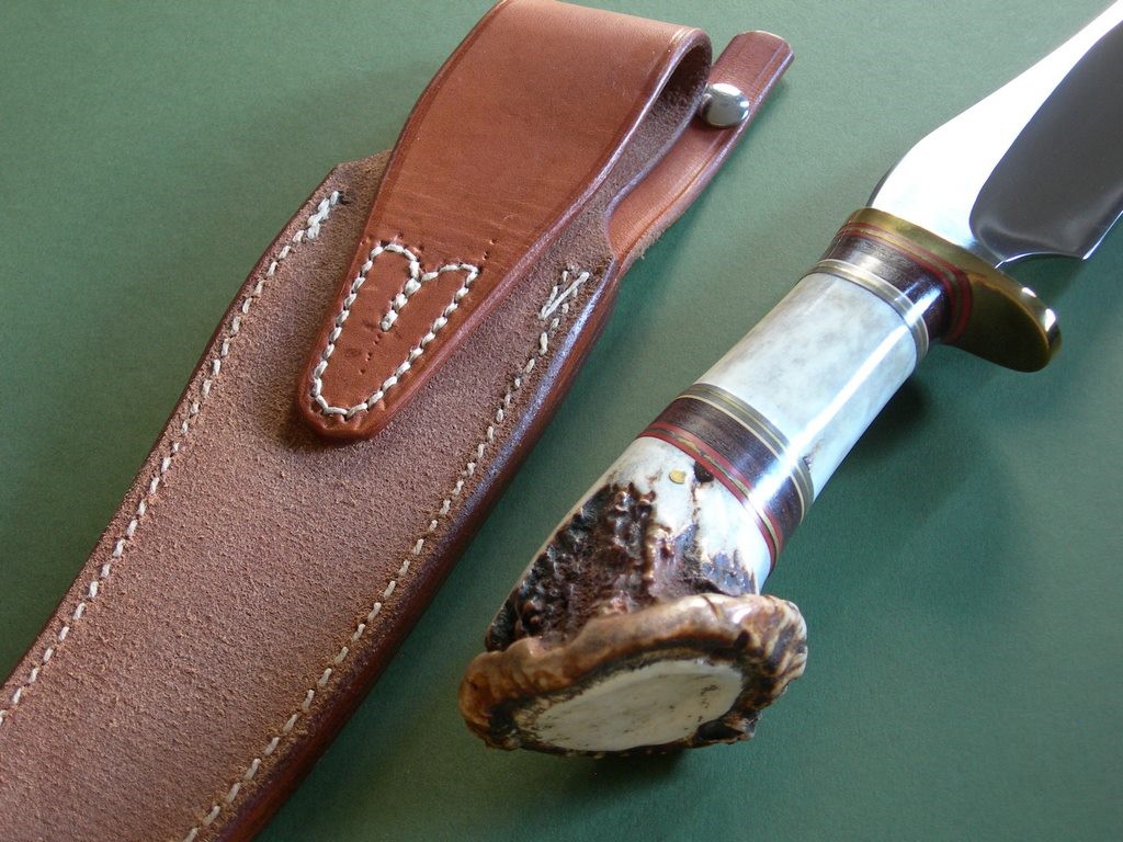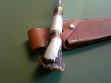 The knife is fitted to a no hone Johnson roughback sheath in excellent+++ condition. The sheath has not been carried, just a few light scuffs here and there. Little to no discoloration at the throat and on the keeper from knife storage, obviously not stored in the sheath. Randall stamp on the front belt loop -- the roughback portion of the sheath pretty much mint